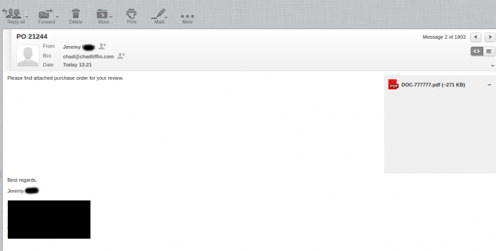 The other day I got an email from a recipient that sounded familiar, with the subject line “PO 21255”. I wasn’t expecting any sort of order, but having a potential client finally pull the trigger on a project that I had long considered dead is not completely unheard of, so I opened up the email.